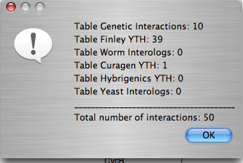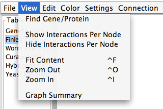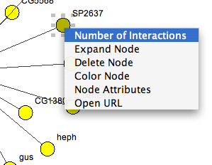 Another way to add interactions to the graph is by expanding nodes. Expanding can be done on one node or all the nodes in the graph at once. Before expanding nodes, the user can check the expected number of interactions. For an individual node the user has to select the node and in a pop-up menu select Number of Interactions. To check the number of expected interactions for all the nodes in the graph, the user selects View - Show Interactions per Node from the main menu. The number of interactions will appear in brackets next to a node label.