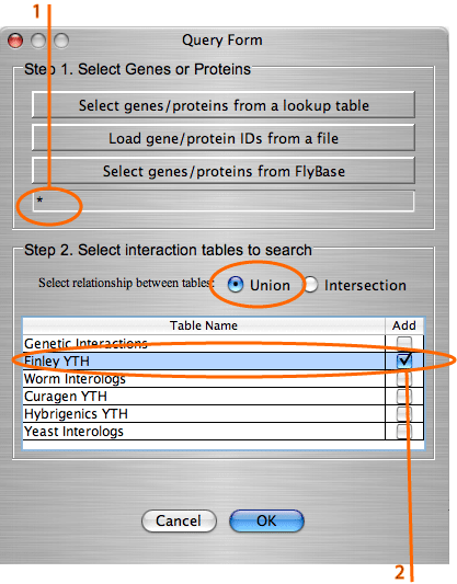 IM Browser query forms provide two radio buttons: "Union" and "Intersection". With the selected Union button the interactions that are found in at least one of the selected tables will be added to the graph. With the selected Intersection button, only interactions that are common to the selected tables will be added to the graph.
